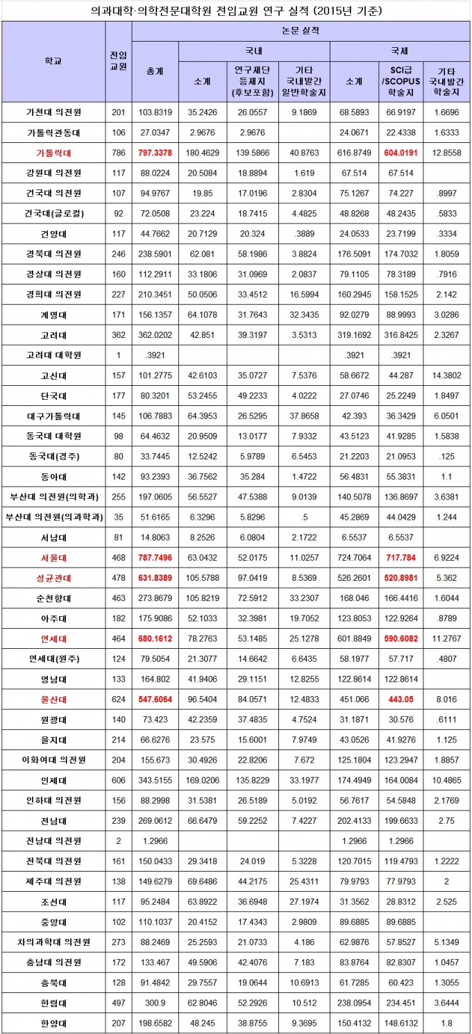 ±³À°ºÎ ´ëÇÐÁ¤º¸°ø½Ã¼¾ÅͰ¡ 8¿ù31ÀÏ °ø½ÃÇÑ Àü±¹ Àǰú´ëÇÐ‧ÀÇÇÐÀü¹®´ëÇпøÀÇ 2015³âµµ ÀüÀÓ±³¿ø ¿¬±¸½ÇÀûÀ» ºÐ¼®ÇÑ °á°ú, SCI±Þ·SCOPUS ±¹Á¦ÇмúÁö ³í¹® ½ÇÀûÀº 717.784ÆíÀ» °ÔÀçÇÑ ¼¿ïÀÇ´ë°¡ ºÎµ¿ÀÇ 1À§¸¦ Â÷ÁöÇß´Ù.