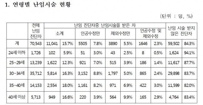 Àüü ³ÀÓ Áø´ÜÀÚÀÇ Àӽżº°ø·üÀº 25~29¼¼(78.1%), 30~34¼¼(77.7%)¼øÀ¸·Î Áý°èµÆÀ¸¸ç Àú¿¬·ÉÃþ(24¼¼ ÀÌÇÏ)°ú °í¿¬·ÉÃþ(40¼¼ ÀÌ»ó) ³ÀÓ ½Ã¼úÀÚµµ Àӽмº°ø·üÀÌ Å©°Ô Áõ°¡ÇÑ °ÍÀ¸·Î È®ÀεƴÙ. ³ÀÓ ½Ã¼úÀÇ ¹ß´Þ·Î ÀÎÇØ ÁßÁõÀÎ °í¿¬·ÉÃþ¿¡¼µµ ¼º°ø·üÀÌ ³ô¾ÆÁö°í ÀÖ´Â °ÍÀ¸·Î ÃßÁ¤µÈ´Ù.