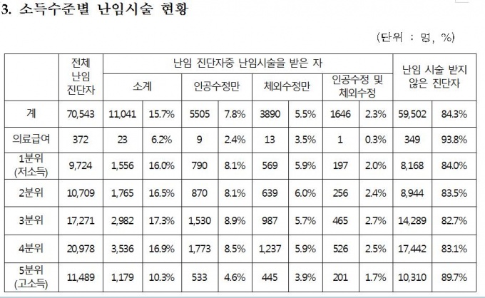 Àӽмº°ø·ü ¿ª½Ã ¼Òµæ 3~4ºÐÀ§¿¡¼ ³ô¾ÒÀ¸³ª(72.5%, 73.8%) ½Ã¼ú ¿©ºÎ¿¡ µû¸¥ Àӽżº°ø·üÀÇ Â÷ÀÌ´Â ÀÇ·á±Þ¿©¼ö±Þ±ÇÀÚ µî Àú¼ÒµæÃþ¿¡¼ ´õ ¶Ñ·ÇÇϹǷΠÀú¼ÒµæÃþ¿¡¼ ÃæºÐÇÑ ½Ã¼úÀ» ¹ÞÀ» ¼ö ÀÖµµ·Ï °æÁ¦Àû Áö¿øÀ» °ÈÇÒ Çʿ䰡 ÀÖ´Â °ÍÀ¸·Î º¸ÀδÙ.