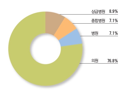 ÀÇ·á±â°ü Á¾º°·Î ³ª´©¸é ÀÇ¿øÀÌ 86°Ç(76.8%)À¸·Î °¡Àå ¸¹¾ÒÀ¸¸ç »ó±ÞÁ¾ÇÕº´¿ø 10°Ç, º´¿ø°ú Á¾ÇÕº´¿øÀº °¢°¢ 8°ÇÀ¸·Î µÚ¸¦ À̾ú´Ù.