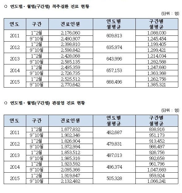 ¸íÀýÀÌ ÀÖ´Â 1~2¿ù°ú 9~10¿ù¿¡´Â ôÃßÁúȯ°ú °üÀý¿°À¸·Î Áø·á¸¦ ¹ÞÀº ȯÀÚ°¡ Æò¼ÒÀÇ 2¹è¿¡ ´ÞÇÏ´Â µî ¸íÀýÁõÈıºÀ¸·Î ¸¹Àº ȯÀÚµéÀÌ °íÅëÀ» ¹Þ°í ÀÖ´Â °ÍÀ¸·Î ³ªÅ¸³µ´Ù.