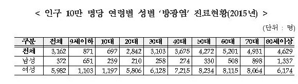 ¹æ±¤¿° ȯÀÚ Áõ°¡´Â ³²¼ºº¸´Ù´Â ¿©¼º¿¡¼ ´õ ¸¹¾Ò´Ù. ³²¼ºÀÌ 2010³â 9¸¸1,000¸í¿¡¼ 2015³â 9¸¸4,000¸íÀ¸·Î 5³â °£ 3,000¸íÀÌ ´Ã¾ú´Âµ¥ ¹ÝÇØ ¿©¼ºÀº 2010³â 133¸¸ 9,000¸í¿¡¼ 2015³â 150¸¸2,000¸íÀ¸·Î 16¸¸ 3000¸í(12.2%)À̳ª ¸¹¾ÆÁ³´Ù.
