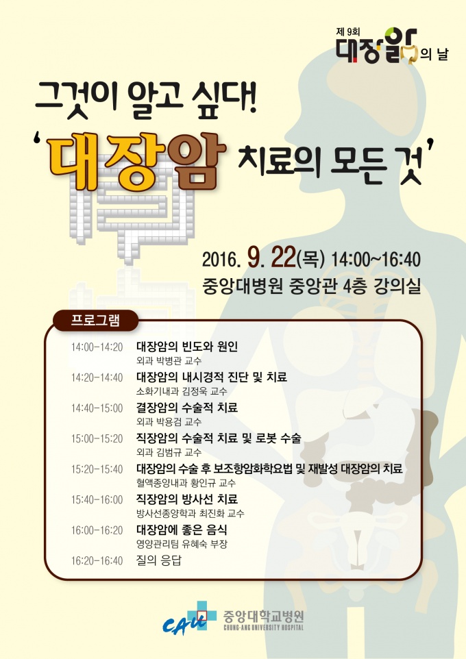 Á߾Ӵ뺴¿ø ±³¼öÁøÀº ‘±×°ÍÀÌ ¾Ë°í ½Í´Ù. ´ëÀå¾Ï Ä¡·áÀÇ ¸ðµç °Í!’À̶ó´Â ÁÖÁ¦·Î ´ëÀå¿¡ »ý±â´Â ´Ù¾çÇÑ ¾Ï¿¡ ´ëÇØ Á¾·ùº°·Î ³ª´©¾î °ÀÇÇÑ´Ù.