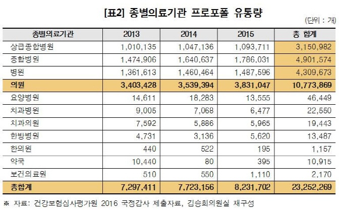 »õ´©¸®´ç ±è½ÂÈñ ÀÇ¿ø¿¡ ±¹Á¤°¨»ç¸¦ ¾ÕµÎ°í Á¤ºÎ ±â°üµé·ÎºÎÅÍ Á¦Ãâ¹ÞÀº ÀÚ·á¿¡ µû¸£¸é, ÃÖ±Ù 3³â °£ Á¾º° ÀÇ·á±â°ü ÇÁ·ÎÆ÷Æú À¯Åë·®Àº ÀÇ¿ø±ÞÀÌ 1,077¸¸3,869°³·Î °¡Àå ¸¹¾Ò°í Á¾ÇÕº´¿øÀÌ 4,90¸¸1,574°³, º´¿øÀÌ 430¸¸9,673°³ ¼øÀ̾ú´Ù.