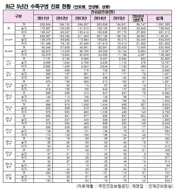 ¿ª½Ã ÀÎ ÀÇ¿øÀÌ °ø´ÜÀ¸·Î Á¦Ãâ¹ÞÀº ‘ÃÖ±Ù 5³â°£ ¼öÁ·±¸º´ ȯÀÚ ÇöȲ’ ÀÚ·á¿¡¼´Â, Áö³ 2011³âºÎÅÍ 2016³â »ó¹Ý±â±îÁö ¼öÁ·±¸º´ Áø·á¸¦ ¹ÞÀº »ç¶÷Àº 139¸¸1,055¸í¿¡ ´ÞÇß°í ÀÌ¿¡ µû¸¥ Áø·áºñ´Â 698¾ï¿øÀ» ³Ñ¾ú´Ù.