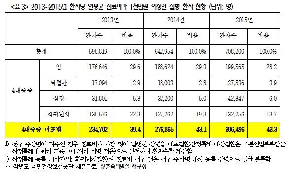 2015³â ±âÁØÀ¸·Î ȯÀÚ´ç Áø·áºñ°¡ ¿¬Æò±Õ 1,000¸¸¿ø ÀÌ»óÀÎ Áúº´ÀÇ È¯ÀÚ 70¸¸8,200¸í Áß 4´ë ÁßÁõÁúȯ¿¡ Æ÷ÇÔµÇÁö ¾Ê´Â ȯÀÚ´Â 43.3%ÀÎ 30¸¸6,496¸íÀ̾ú´Ù.
