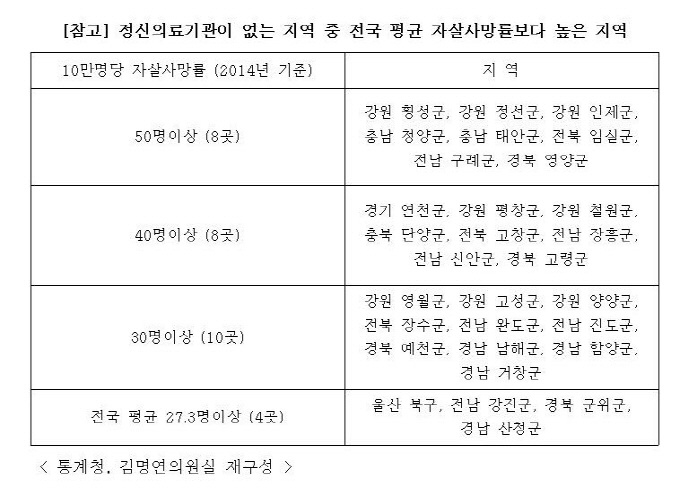 ±¹È¸ º¸°Çº¹ÁöÀ§¿øÈ¸ ±è¸í¿¬ ÀÇ¿øÀÌ º¸°Çº¹ÁöºÎ µî·Ï Á¤½ÅÀÇ·á±â°ü ÇöȲ°ú 2014³â ±âÁØ ÀÚ»ì»ç¸Á·üÅë°è¸¦ ºÐ¼®ÇÑ °á°ú, Á¤½ÅÀÇ·á±â°üÀÌ ¾ø´Â ÁöÀÚü 43°³ Áö¿ª Áß 30°÷ÀÇ ÀÚ»ì»ç¸Á·üÀÌ Àü±¹ Æò±ÕÀÎ 27.3¸íº¸´Ù ³ôÀº 42.58¸íÀ̾ú´Ù.