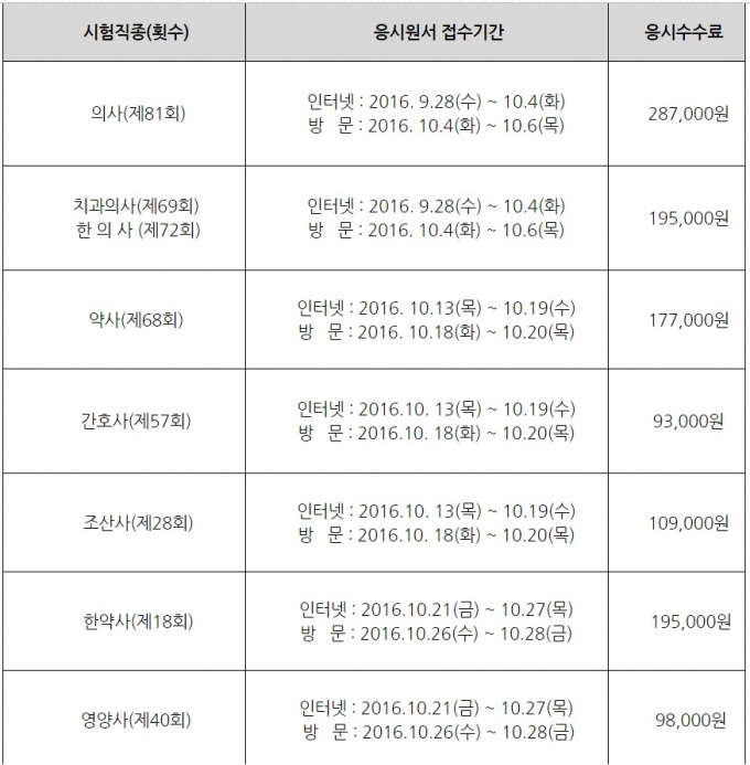 Á¢¼ö Á÷Á¾Àº ÀÇ»ç·Ä¡°úÀÇ»ç·ÇÑÀǻ縦 ºñ·ÔÇØ ¹°¸®Ä¡·á»ç·¹æ»ç¼±»ç·ÀÓ»óº´¸®»ç·¾È°æ»ç·Àǹ«±â·Ï»ç·¾ð¾îÀçȰ»ç µî ÀÌ´Ù. ÀÀ½Ã¼ö¼ö·á´Â ÀÇ»ç½ÃÇèÀÌ 28¸¸7000¿ø, Ä¡°úÀÇ»ç ¹× ÇÑÀÇ»ç½ÃÇèÀº 19¸¸5000¿ø µîÀÌ´Ù.