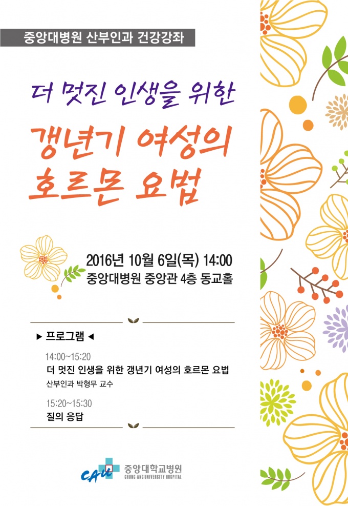 Áß¾Ó´ëÇб³º´¿ø(¿øÀå ±è¼º´ö)Àº 10¿ù 6ÀÏ º´¿ø µ¿±³È¦¿¡¼ ‘´õ ¸ÚÁø ÀλýÀ» À§ÇÑ °»³â±â ¿©¼ºÀÇ È£¸£¸ó ¿ä¹ý'À̶õ ÁÖÁ¦·Î °Ç°°Á¸¦ °³ÃÖÇÑ´Ù.