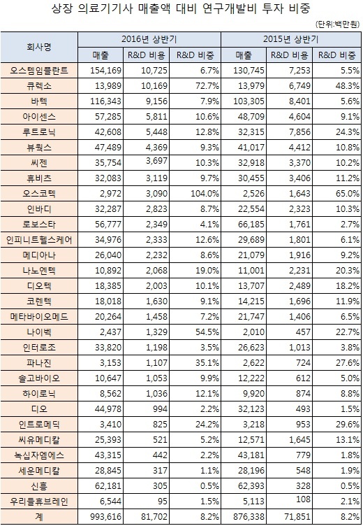 ¿Ã »ó¹Ý±â »óÀå ÀÇ·á±â±â ¾÷üÀÇ R&D ÅõÀÚºñ¿ëÀº ÃÑ 817¾ï¿øÀ¸·Î Áö³ÇØ »ó¹Ý±â 719¾ï¿øº¸´Ù 13.7% Áõ°¡ÇÑ °ÍÀ¸·Î ³ªÅ¸³µ´Ù. ¶Ç ÀÌµé ¾÷üÀÇ ¸ÅÃâ¾× ´ëºñ ¿¬±¸°³¹ß(R&D) ÅõÀÚºñÁßÀº Áö³ÇØ¿Í °°Àº Æò±Õ 8.2%ÀÎ °ÍÀ¸·Î È®ÀεƴÙ.