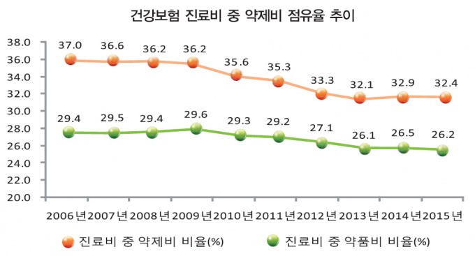 Áø·áºñ Áß ¾àÁ¦ºñÀ²Àº 2006³â 37%¿¡¼ 2015³â 32.4%·Î ÁÙ¾úÀ¸¸ç, Áø·áºñ Áß ¾àǰºñ ºñÀ² ¿ª½Ã 2006³â 29.4%¿¡¼ 26.2%·Î 3.2%P ¶³¾îÁ³´Ù.