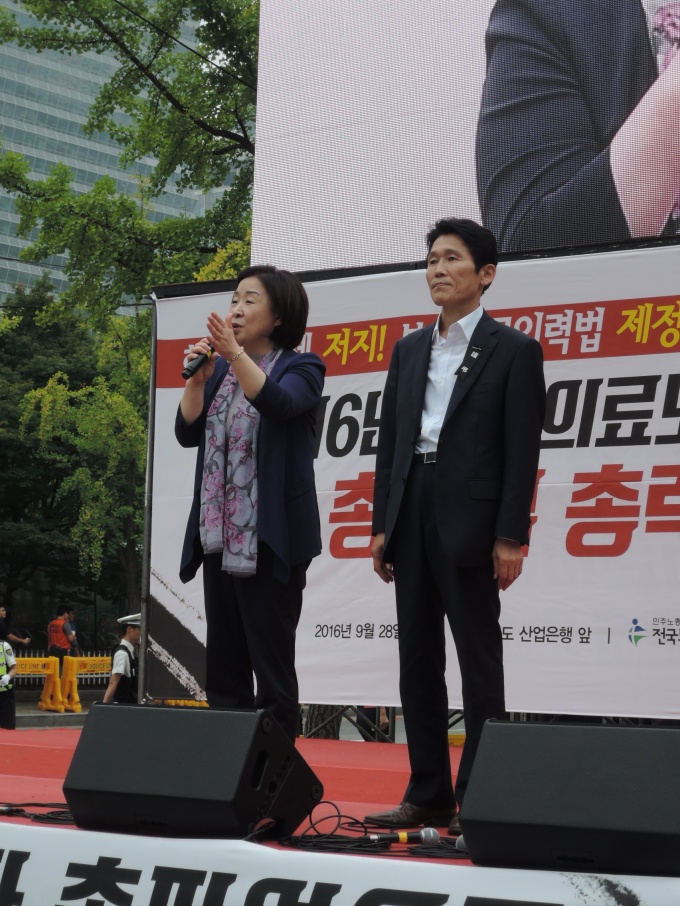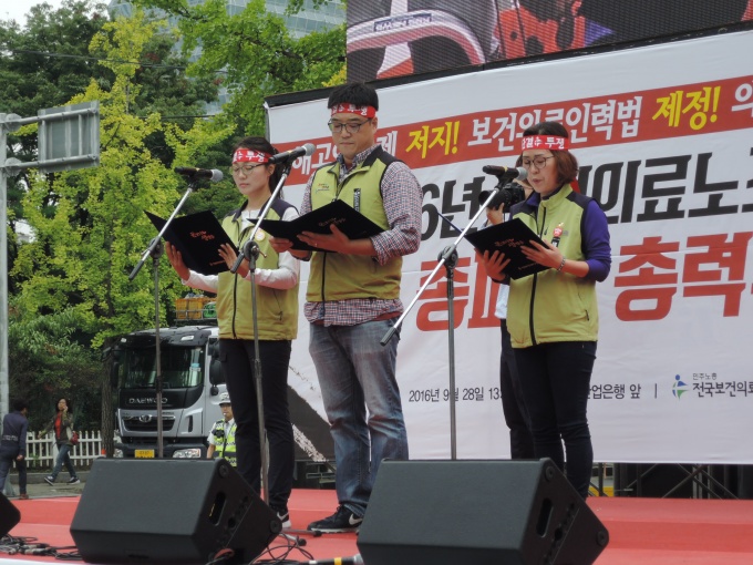 º¸°ÇÀÇ·á³ëÁ¶°¡ 28ÀÏ ¿ÀÈÄ 1½Ã 30ºÐ ¿©Àǵµ »ê¾÷ÀºÇà ¾Õ¿¡¼ ÃâÁ¤½ÄÀ» °®°í ÃÑÆÄ¾÷À» ¼±Æ÷Çß´Ù.