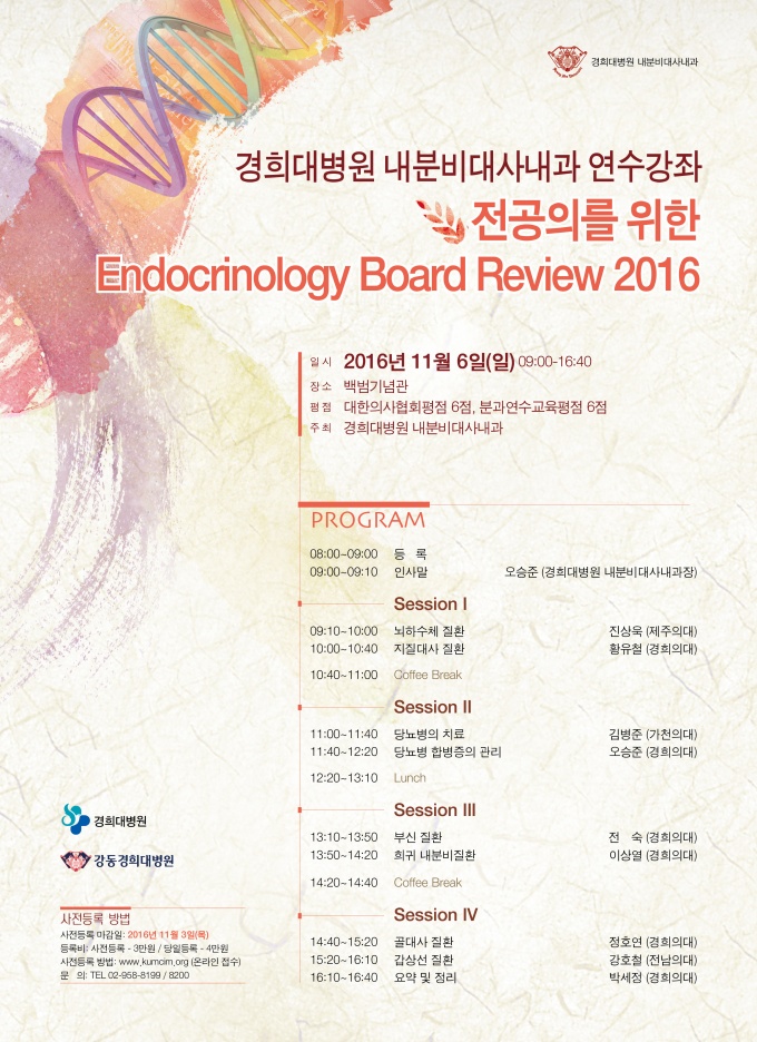 °æÈñ´ëÇб³º´¿ø ³»ºÐºñ´ë»ç³»°ú(°úÀå ¿À½ÂÁØ)´Â ¿À´Â 11¿ù 6ÀÏ ¼¿ï ¿ë»ê±¸ ¹é¹ü±è±¸±â³ä°ü¿¡¼ Àü°øÀǸ¦ À§ÇÑ ‘Endocrinology Board Review 2016' ¿¬¼ö°Á¸¦ °³ÃÖÇÑ´Ù°í ¹àÇû´Ù.