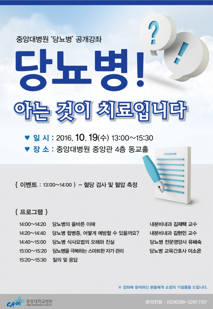 À̹ø °Á´ ´ç´¢º´¿¡ °ü½ÉÀÖ´Â ÀϹÝÀÎÀÌ¸é ´©±¸³ª Âü¼® °¡´ÉÇϰí ÀÚ¼¼ÇÑ ¹®ÀÇ´Â Á߾Ӵ뺴¿ø ´ç´¢º´¼¾ÅÍ(02-6299-3247) ¶Ç´Â Áø·áÇù·ÂÆÀ(02-6299-1157)À¸·Î ¿¬¶ôÇÏ¸é µÈ´Ù. |