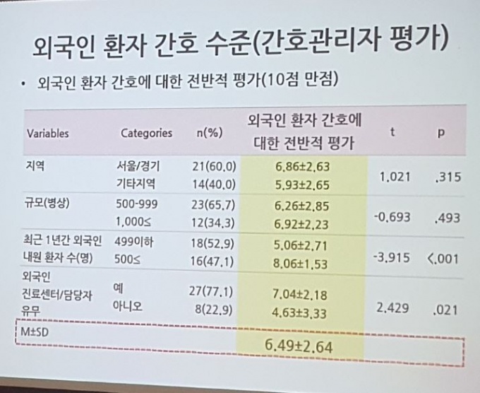 Çѱ¹¹æ¼ÛÅë½Å´ëÇб³ °£È£Çаú ÃÖÀ±Á¤ ±³¼ö´Â “¿Ü±¹ÀΠȯÀÚµéÀÌ ±¹³» °£È£¿¡ ´ëÇØ °®´Â Æí¾ÈÇÔ ¹× °£È£ ¼÷·Ãµµ µîÀÇ ÀνÄÀ» Á¡¼öÈÇÏ¸é ¼öÄ¡°¡ ³·Àº Æí”À̶ó¸ç “°£È£°ü¸®ÀÚµéÀÌ Á÷Á¢ ¸Å±ä ¿Ü±¹ÀΠȯÀÚ °£È£¿¡ ´ëÇÑ Àü¹ÝÀûÀÎ Æò°¡´Â 100Á¡ ¸¸Á¡¿¡ 65Á¡¿¡ ºÒ°úÇß´Ù”°í ÁöÀûÇß´Ù.