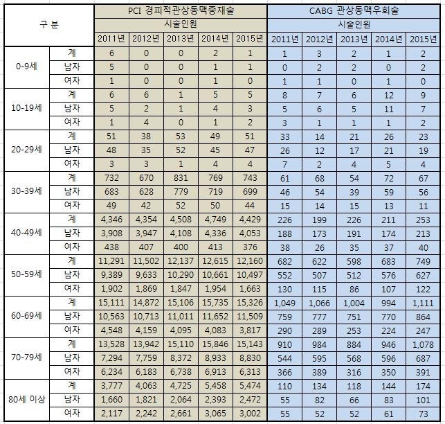 ÃÖ±Ù µ¥Àϸ®¸Þµð°¡ °Ç°º¸Çè½É»çÆò°¡¿ø º¸°ÇÀÇ·áºòµ¥ÀÌÅÍ ÀڷḦ ºÐ¼®ÇÑ °á°ú, ÃÖ±Ù 5³â°£(2011~2015³â) PCI ½Ã¼ú°ú CABG ¼ö¼úÀ» ¹ÞÀº ȯÀÚ´Â 15:1 ¼öÁØÀ» À¯ÁöÇß´Ù.