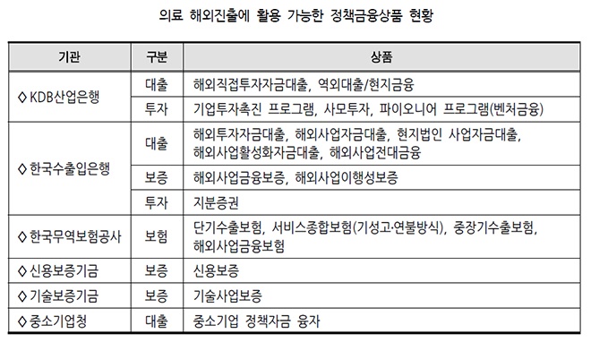 ÀÌ¿¡ Çѱ¹º¸°Ç»ê¾÷ÁøÈï¿øÀÌ 'ÀÇ·á ÇØ¿ÜÁøÃâ À°¼ºÀ» À§ÇÑ ±ÝÀ¶Áö¿ø ¹æ¾È ¿¬±¸'¸¦ ¹ß°£Çϰí ÀÇ·á ÇØ¿ÜÁøÃâ¿¡ Ȱ¿ë °¡´ÉÇÑ Á¤Ã¥±ÝÀ¶»óǰÀ» ¼Ò°³Çß´Ù.
