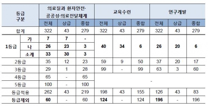 ÀÇ·áÁúÆò°¡Áö¿ø±Ý¿¡¼ °¡Àå ¸¹Àº ºñÁßÀÎ 65%¸¦ Â÷ÁöÇÏ´Â ‘ȯÀÚ¾ÈÀü·°ø°ø¼º·ÀÇ·áÀü´Þü°è’ ¿µ¿ª¿¡¼ »ó±ÞÁ¾ÇÕº´¿ø 43°÷ °¡¿îµ¥ 30°÷ÀÌ 1µî±ÞÀ» ¹ÞÀº °ÍÀ¸·Î Á¶»çµÆ´Ù. ¹Ý¸é Á¾ÇÕº´¿øÀº 273°÷ Áß ´Ü 3°÷¿¡ ºÒ°úÇß´Ù.