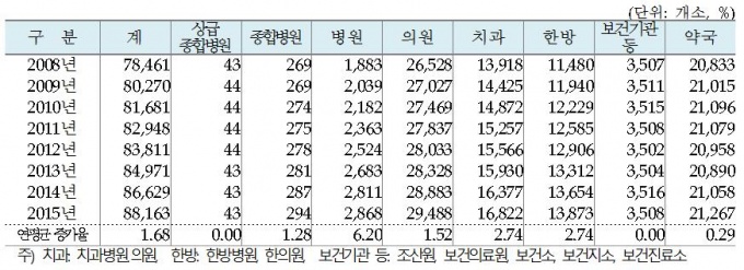 ÀÌ Áß º´¿ø±Þ ÀÇ·á±â°ü Áõ°¡À²ÀÌ 6.2%·Î °¡Àå ³ô¾Ò´Ù. 2008³â º´¿ø±ÞÀº 1883°÷¿¡¼ 2015³â 2868°÷À¸·Î 8³â»õ ¾à 1000°÷ÀÌ ½Å±Ô·Î ÁøÀÔÇß´Ù.