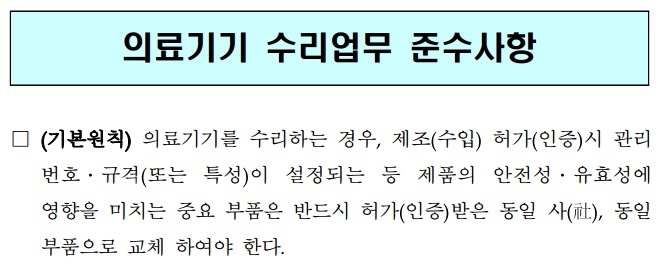 ½Ä¾àó ÀÇ·á±â±â¾ÈÀü±¹ °ü°èÀÚ´Â “‘ÀÇ·á±â±â ¼ö¸®¾÷¹« Áؼö»çÇ×’Àº Á¦Á¶·¼öÀÔ¾÷°è¿Í ¼ö¸®¾÷°è ÀǰßÀ» ¼ö·ÅÇØ¼ ¸¶·ÃµÆ´Ù”¸ç “ÀÇ·á±â±âÀÇ Á¦Á¶·¼öÀÔ¾÷°è°¡ °Á¶ÇÑ ¾ÈÀü¼º ¹× À¯È¿¼º°ú ÇÔ²² ¼ö¸®¾÷°è°¡ ÁÖÀåÇÑ ¿µ¾÷±ÇÀÌ Á¾ÇÕÀûÀ¸·Î ¹Ý¿µµÈ °Í”À̶ó°í ¼³¸íÇß´Ù. |