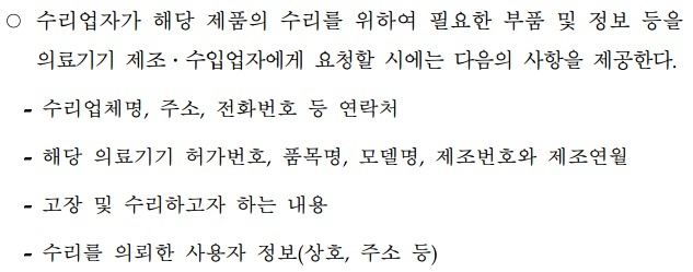 ÀÌ¾î “¼ö¸®¾÷ÀÚ´Â ¼ö¸®¾÷¹«¿¡ ÇÊ¿äÇÑ »çÇ× µîÀ» Á¦Á¶·¼öÀÔ¾÷ÀڷκÎÅÍ ¹Ì¸® È®ÀÎ ÈÄ ¼ö¸®ÇØ¾ß ÇÑ´Ù”¸ç “¼ö¸®¾÷ÀÚ°¡ ÇØ´ç Á¦Ç°ÀÇ ¼ö¸®¸¦ À§ÇØ ºÎǰ ¹× Á¤º¸ µîÀ» Á¦Á¶·¼öÀÔ¾÷ÀÚ¿¡°Ô ¿äûÇÒ °æ¿ì ¼ö¸®¸¦ ÀÇ·ÚÇÑ ‘»ç¿ëÀÚ Á¤º¸‘(»óÈ£, ÁÖ¼Ò µî)¸¦ Á¦°øÇÑ´Ù”°í ÀüÇß´Ù.