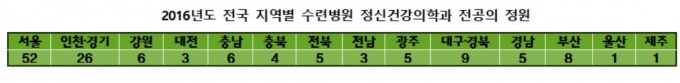 ´ëÇѽŰæÁ¤½ÅÀÇÇÐȸ¿¡ µû¸£¸é, ¿ÃÇØ Àü±¹ ¼ö·Ãº´¿ø¿¡ ¹èÄ¡µÈ Á¤½Å°Ç°ÀÇÇаú Àü°øÀÇ(·¹Áö´øÆ®) ÃÑÁ¤¿øÀº 134¸íÀ¸·Î, ±× Áß Àý¹ÝÀ» Èǽ ³Ñ´Â ÀοøÀÎ 78¸íÀÌ ¼¿ï°ú °æ±â, ÀÎõ ¼ÒÀç º´¿øÀ¸·Î ½ò·ÁÀÖ´Â °ÍÀ¸·Î Á¶»çµÆ´Ù.