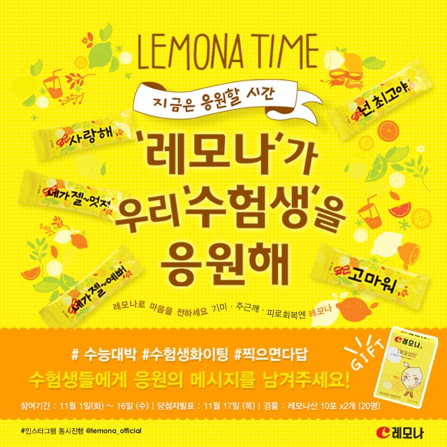 °æ³²Á¦¾à(´ëÇ¥ ·ùÃæÈ¿)Àº °í3 ¼öÇè»ýÀ» ÀÀ¿øÇϱâ À§ÇØ ·¹¸ð³ª SNS °ø½Ä ä³Î¿¡¼ 'LEMONA TIME’ Áö±ÝÀº ÀÀ¿øÇÒ ½Ã°£, ·¹¸ð³ª°¡ ¿ì¸® ¼öÇè»ýÀ» ÀÀ¿øÇØ’ À̺¥Æ®¸¦ ÁøÇàÇÑ´Ù°í 2ÀÏ ¹àÇû´Ù.