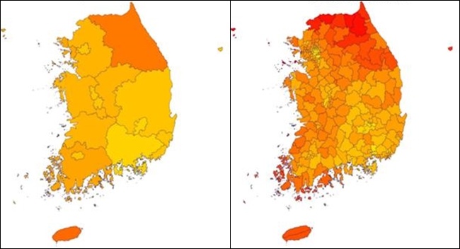 º¸´Ù ¼¼ºÐÈµÈ ½Ã±º±¸±îÁö ÆÄ¾ÇÇÑ °á°ú ÀÎõ±¤¿ª½Ã ¿ËÁø±º°ú °æ»óºÏµµ ¿ï¸ª±º, Àü¶ó³²µµ ½Å¾È±º, Àü¶ó³²µµ ¿Ïµµ±º°ú °°Àº ¼¶ Áö¿ªµéÀÌ ³ôÀº ºñ¸¸°ú °íµµºñ¸¸ À¯º´·üÀ» º¸¿´´Ù.