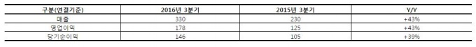 3ºÐ±â ´©Àû ¿µ¾÷ÀÌÀÍÀº 41%Áõ°¡ÇÑ 531¾ï¿ø, ´ç±â¼øÀÌÀÍÀº 43% Áõ°¡ÇÑ 442¾ï¿øÀ» ±â·ÏÇß´Ù. ¸ÅÃâ¾×°ú ¿µ¾÷ÀÌÀÍ, ´ç±â¼øÀÌÀÍ ¸ðµÎ Àü³âµµ ½ÇÀû 885¾ï¿ø, 517¾ï¿ø, 423¾ï¿øÀ» ¶Ù¾î³Ñ¾ú´Ù.