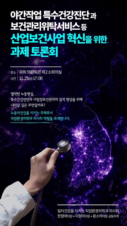 'ÀÏÅÍ °Ç°À» ÁöŰ´Â Á÷¾÷ȯ°æÀÇÇаú ÀÇ»çȸ'°¡ ¾ß°£ÀÛ¾÷ Ư¼ö°Ç°Áø´Ü°ú º¸°Ç°ü¸®À§Å¹¼ºñ½º µî »ê¾÷º¸°Ç»ç¾÷ Çõ½ÅÀ» À§ÇÑ °úÁ¦ Åä·Ðȸ¸¦ 25ÀÏ ¿ÀÈÄ 5½Ã ±¹È¸ÀÇ¿øÈ¸°ü Á¦2 ¼ÒȸÀǽǿ¡¼ °³ÃÖÇÑ´Ù.