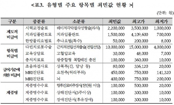 ÃÖÀú°¡¿Í ÃÖ°í°¡°¡ ¸ðµÎ ÀλóµÈ Ç׸ñÀº MRIÁø´Ü·á(°æÃß), ¾ç¼ö¿°»öü°Ë»ç·á µî 3°³ Ç׸ñÀ̾ú´Ù. ¶Ç ÃÖÀú°¡¿Í ÃÖ°í°¡ ¸ðµÎ º¯µ¿ÀÌ ¾ø´Â Ç׸ñÀº Á¦Áõ¸í¼ö¼ö·á 7Ç׸ñ, Ãß³ª¿ä¹ý ¹× ¶ó½Ä µî ÃÑ 9Ç׸ñÀ̾ú´Ù.