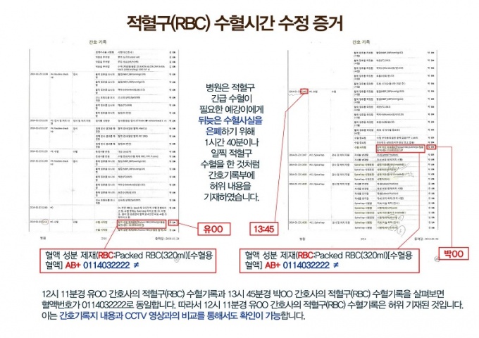 À̵éÀº “¼Ò¼ÛÀ» ÁøÇàÇÏ´ø Áß Áø·á±â·ÏºÎ¿¡¼ ÀûÇ÷±¸(RBC)¼öÇ÷½Ã°£ÀÌ Á¶ÀÛµÈ »ç½ÇÀ» ¹ß°ßÇß´Ù”¸ç °£È£±â·ÏÁö¿¡ 12½Ã 11ºÐ°ú 13½Ã 45ºÐ¿¡ µÎ ¹øÀÇ ¼öÇ÷±â·ÏÀÌ ÀÖ´Ù°í ¹àÇû´Ù.