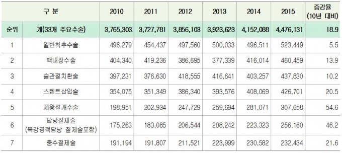 À̵é 33°³ ÁÖ¿ä ¼ö¼ú °Ç¼ö´Â 2010³â 168¸¸9000°Ç¿¡¼ 2015³â 172¸¸1000°ÇÀ¸·Î, 2010³â ´ëºñ 1.9% Áõ°¡Çß´Ù.