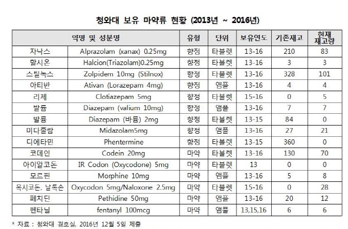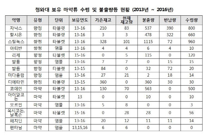 Á¤ÀÇ´ç À±¼ÒÇÏ ÀÇ¿øÀÌ Ã»¿Í´ë·ÎºÎÅÍ ¸¶¾à·ù Àç»ê´ëÀåÀ» Á¦Ãâ¹Þ¾Æ ºÐ¼®ÇÑ °á°ú ±âÁ¸ û¿Í´ë ±¸¸Å ÀǾàǰ ¸ñ·Ï¿¡¼ È®Àεƴø ÀÚ³«½º, ÇҽÿÂ, ½ºÆ¿³ì½º ¿Ü¿¡ ¾ÆÆ¼¹Ý, ¸®Á¦, ¹ß·ý(Á¤), ¹ß·ý(¾ÚÇÃ), ¹Ì´ÙÁ¹¶÷, µð¿¡Å¸¹Î 6Á¾ÀÇ ÇâÁ¤¾àÀ» »ç¿ëÇØ¿Ô´Ù.