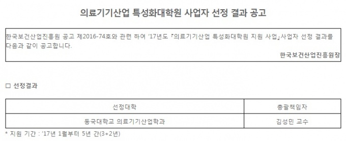 º¸°Çº¹ÁöºÎ´Â 14ÀÏ ÀÇ·á±â±â»ê¾÷ Ư¼ºÈ´ëÇпø Áö¿ø»ç¾÷ »ç¾÷ÀÚ ¼±Á¤ °á°ú, µ¿±¹´ëÇб³ ÀÇ·á±â±â»ê¾÷Çаú°¡ ¼±Á¤µÆ´Ù°í ¹àÇû´Ù.