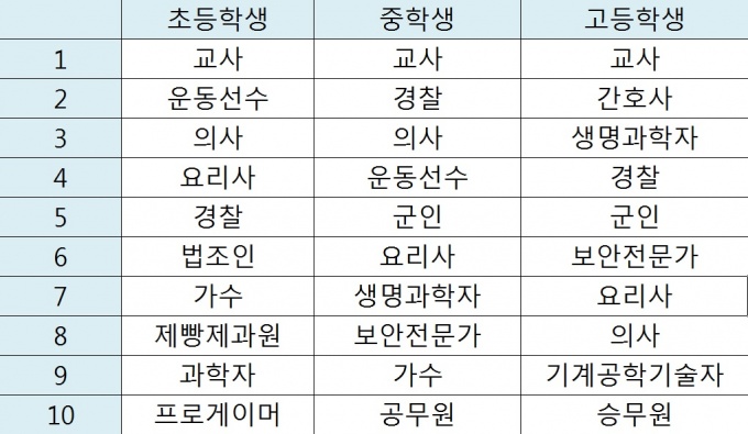 Á¶»ç°á°ú ÃÊ·Áß·°íµîÇлý ¸ðµÎ Èñ¸ÁÁ÷¾÷ 1À§¸¦ ±³»ç·Î ²Å¾Ò´Ù. ÃʵîÇлýÀº 9.6%, ÁßÇлýÀº 13.5%, °íµîÇлý Áß¿¡¼´Â 12%°¡ ±³»ç¸¦ Èñ¸ÁÇÑ´Ù°í ´äÇß´Ù.