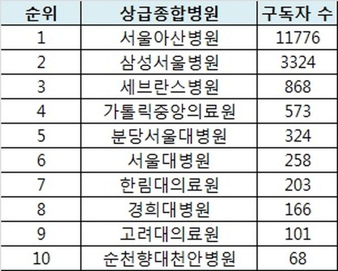 5À§´Â ºÐ´ç¼¿ï´ëº´¿ø(324¸í)ÀÌ ¼¿ï´ëº´¿ø(258¸í)À» Á¶±Ý ¾Õ¼¹°í, ÇѸ²´ëÀÇ·á¿ø(203¸í), °æÈñ´ëº´¿ø(166¸í) µîÀÌ µÚ¸¦ À̾ú´Ù.
