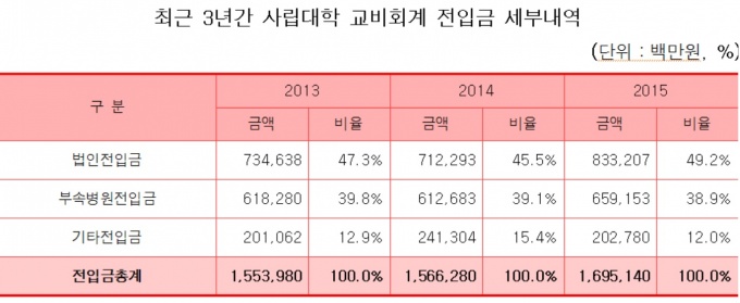 Çѱ¹»çÇÐÁøÈïÀç´ÜÀº ÃÖ±Ù ‘2016 »ç¸³´ëÇÐÀçÁ¤Åë°è¿¬º¸’¸¦ ¹ß°£ÇÏ°í “»ç¸³´ëÇÐ ±³ºñȸ°è ÀüÀÔ±Ý °¡¿îµ¥ ºÎ¼Óº´¿øÀ¸·ÎºÎÅÍ µé¾î¿À´Â ÀüÀÔ±ÝÀÌ 2013 ȸ°è¿¬µµ(ÀÌÇÏ ³âµµ)¿¡´Â 6182¾ï8000¸¸¿ø, 2014³âµµ¿¡´Â 6126¾ï8300¸¸¿ø, 2015³âµµ 6591¾ï5300¸¸¿øÀ¸·Î ³ªÅ¸³µ´Ù”°í ¹àÇû´Ù.