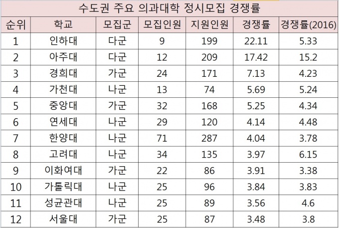 2017Çг⵵ °¢ Àǰú´ëÇÐ Á¤½Ã¸ðÁý °á°ú ¼¿ïÀÇ´ë¿Í ¿¬¼¼ÀÇ´ë, ¼º±Õ°üÀÇ´ë °æÀï·üÀÌ ¼ÒÆø Ç϶ôÇÑ °ÍÀ¸·Î ³ªÅ¸³µ´Ù. ¼¿ï ¼ÒÀç ´ëÇÐ Áß¿¡´Â °æÈñÀÇ´ë°¡ 7.13´ë 1·Î °¡Àå ³ôÀº °æÀï·üÀ» ±â·ÏÇß´Ù.