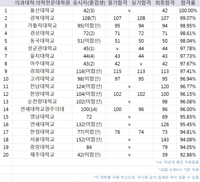 Áö³ÇØ 100% ÇÕ°Ý ¼º°ú¸¦ ºÃ´ø ¿µ³²ÀÇ´ëµµ ¿ÃÇØ´Â 3¸íÀÌ Å»¶ô, 95%¸¦ ±â·ÏÇß´Ù. °¡Å縯ÀÇ´ë´Â Áö³ÇØ 2¸í Å»¶ô¿¡¼ ¿ÃÇØ 1¸í Å»¶ôÀ¸·Î 1% ¿À¸¥ 98%ÀÇ ÇÕ°Ý·üÀ» º¸¿´´Ù.
