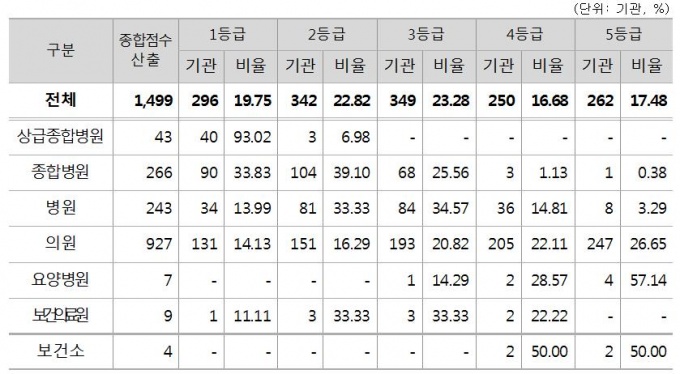 1499°³ ±â°ü Áß 1µî±ÞÀº 296±â°üÀ¸·Î 19.75%¸¦ Â÷ÁöÇßÀ¸¸ç, º´¿øÁ¾º°·Î´Â »ó±ÞÁ¾ÇÕº´¿øÀÇ 93.02%, ÀÇ¿øÀÇ 14.13%°¡ 1µî±Þ±â°üÀ¸·Î ³ªÅ¸³ª º´¿øÁ¾º° °£ ÆíÂ÷°¡ ÄÇ´Ù.
