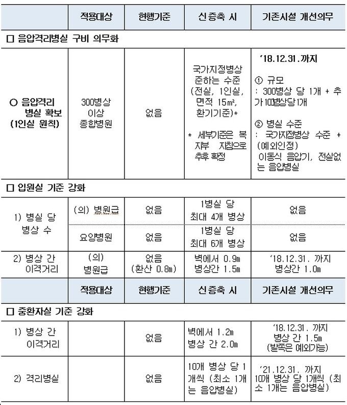 ¶ÇÇÑ 10°³ º´»ó ´ç 1°³ ÀÌ»óÀÇ °Ý¸®º´½ÇÀ» ±¸ºñÇØ¾ß Çϸç, ÀÌ Áß ÃÖ¼Ò 1°³´Â À½¾Ðº´½ÇÀ̾î¾ß ÇÑ´Ù. ±âÁ¸ ½Ã¼³ÀÇ °æ¿ì 2021³â 12¿ù 31ÀϱîÁö ÀÌ ±âÁØÀ» ÀÌÇàÇØ¾ß ÇÑ´Ù.