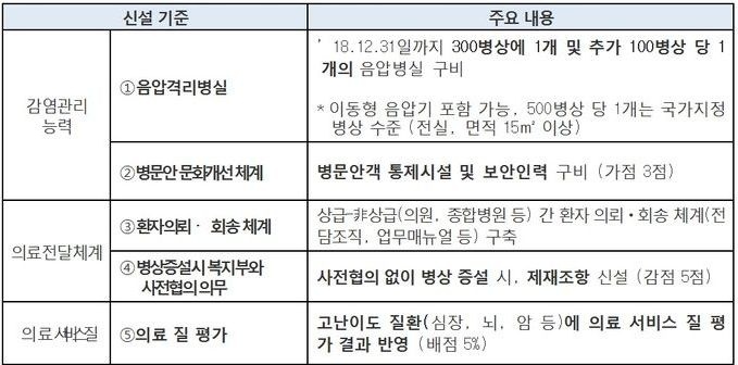 º¹ÁöºÎÀÇ ‘»ó±ÞÁ¾ÇÕº´¿ø ÁöÁ¤±âÁØ °³Á¤¾È’À» »ìÆìº¸¸é ¿ì¼± °¨¿°º´ Ä¡·á¸¦ À§ÇÑ À½¾Ð°Ý¸®º´½Ç ±¸ºñ°¡ Àǹ«È µÈ´Ù. »ó±ÞÁ¾ÇÕº´¿øÀ¸·Î ÁöÁ¤¹Þ±â À§Çؼ´Â 300º´»ó ´ç 1°³ ¹× Ãß°¡ 100º´»ó ´ç 1°³ÀÇ À½¾Ðº´»óÀ» ¼³Ä¡ÇØ¾ß ÇÑ´Ù.