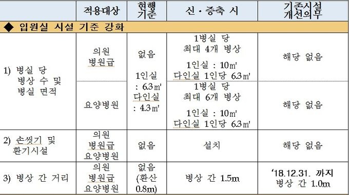 ƯÈ÷ º´»ó °£ °Å¸®´Â 1.5m ÀÌ»ó È®´ëÇØ¾ß ÇÑ´Ù. ±âÁ¸ º´¿øµéÀÇ °æ¿ì º´½Ç ´ç º´»ó¼ö Á¦ÇѰú ¸éÀû È®´ë´Â ¸éÁ¦µÇÁö¸¸ º´»ó °£ °Å¸®´Â 2018³â 12¿ù 31ÀϱîÁö 1.0m·Î ¸ÂÃç¾ß ÇÑ´Ù.