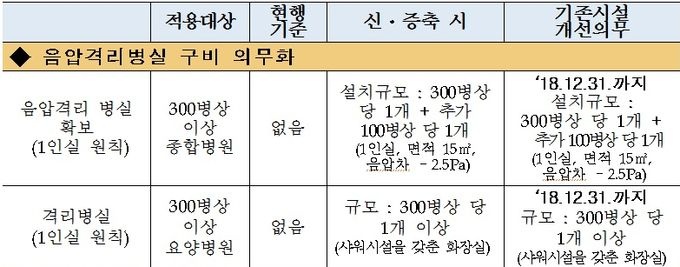 ¶ÇÇÑ º´»ó 10°³ ´ç 1°³ ÀÌ»óÀÇ °Ý¸®º´½ÇÀ» °®ÃßµÇ, ÀÌ Áß ÃÖ¼Ò 1°³ ÀÌ»óÀº À½¾Ð°Ý¸®º´½Ç·Î ²Ù·Á¾ß ÇÑ´Ù. ±âÁ¸ º´¿øµéÀº 2021³â 12¿ù 31ÀϱîÁö ÀÌ ±âÁØÀ» ÁؼöÇØ¾ß ÇÑ´Ù.