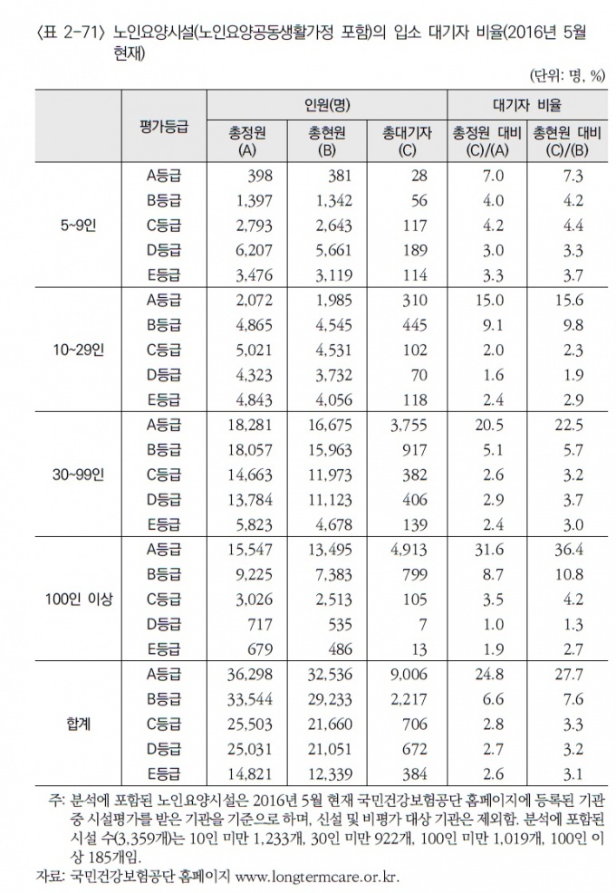 ÀÌ¿¡ µû¶ó Àüü ³ëÀοä¾ç½Ã¼³ ´ë±âÀÚ´Â ÃÑ 1¸¸2985¸í¿¡ ´ÞÇÏ´Â °ÍÀ¸·Î Áý°èµÆ´Ù. µî±Þº°·Î º¸¸é Aµî±Þ¿¡´Â Á¤¿ø ´ëºñ 24.8%, Bµî±Þ 6.6%, C~Eµî±ÞÀº ´ë·« 2% ³»¿ÜÀÇ ´ë±âÀÚ°¡ Á¸ÀçÇß´Ù.