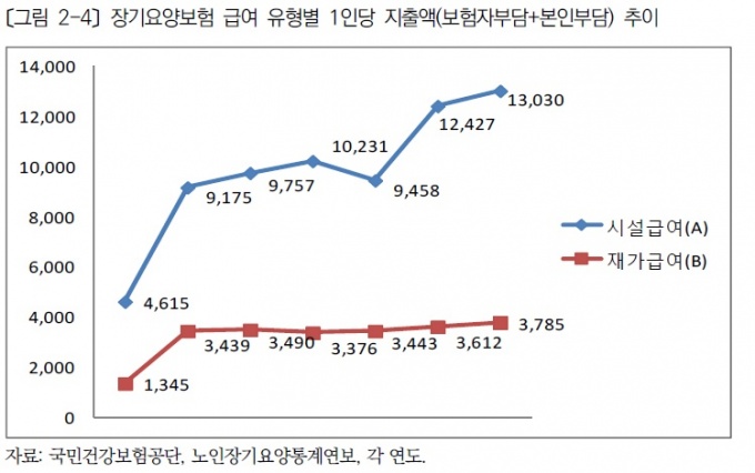 ÀÌ¿ëÀÚµéÀÇ ½Ã¼³ ¼±È£´Â ±Þ¿© ÁöÃâ¿¡¼µµ µå·¯³´Ù. 2015³âµµ ±âÁØ Àå±â¿ä¾çº¸Çè ±Þ¿© À¯Çüº° 1ÀÎ ´ç ÁöÃâ¾×(º¸ÇèÀںδã+º»Àκδã)Àº ½Ã¼³±Þ¿©°¡ 1303¸¸¿ø, Àç°¡±Þ¿©°¡ 378¸¸¿øÀ¸·Î, 3.4¹èÀÇ °ÝÂ÷¸¦ º¸¿´´Ù.