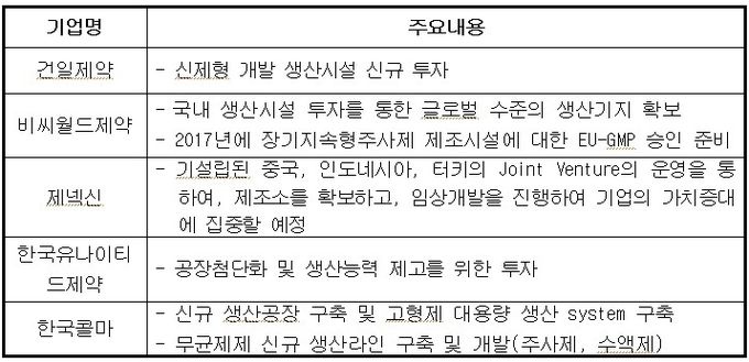 °ÇÀÏÁ¦¾àÀº ½ÅÁ¦Çü °³¹ß »ý»ê½Ã¼³À», ºñ¾¾¿ùµåÁ¦¾àÀº Ä«¹ÙÆä³Û ÁÖ»çÁ¦ »ý»ê½Ã¼³À» ÃßÁøÇÏ´Â µî ½Å±Ô ÅõÀÚµµ È®´ëµÉ ¿¹Á¤ÀÌ´Ù.