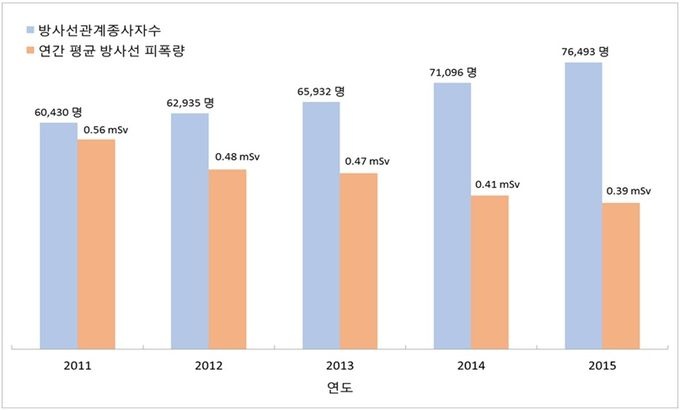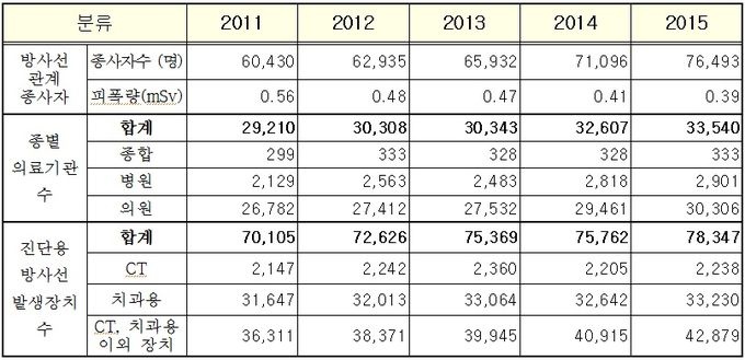 Áúº´°ü¸®º»ºÎ(º»ºÎÀå Á¤±â¼®)°¡ ÃÖ±Ù ¹ß°£ÇÑ ‘2015³âµµ ÀÇ·á±â°ü ¹æ»ç¼±°ü°èÁ¾»çÀÚÀÇ °³ÀÎ ÇÇÆø¼±·® ¿¬º¸’¿¡ µû¸£¸é ±¹³» ¹æ»ç¼±°ü°èÁ¾»çÀÚ´Â 7¸¸6493¸íÀ¸·Î Áý°èµÆ´Ù. ÀÌ´Â 2011³â ´ëºñ 26.6% Áõ°¡ÇÑ ¼öÄ¡´Ù.