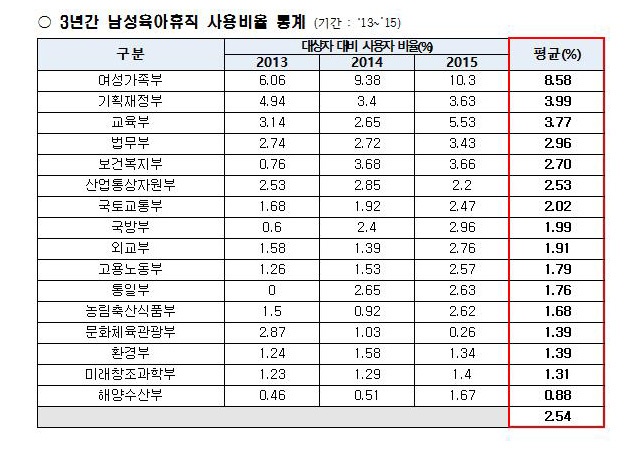 ÀúÃâ»ê·°í·ÉÈ´ëåƯº°À§¿øÈ¸ »õ´©¸®´ç À±Á¾ÇÊÀÇ¿øÀÌ ÀλçÇõ½Åó·ÎºÎÅÍ Á¦Ãâ¹ÞÀº ‘ÁÖ¿ä ºÎóº° À°¾ÆÈÞÁ÷ »ç¿ëÇöȲ’¿¡ µû¸£¸é, ÃÖ±Ù 3³â °£ Á¤ºÎºÎó ³²¼ºÀ°¾ÆÈÞÁ÷ »ç¿ë ºñÀ²Àº Àüü Æò±Õ 2.54%¿¡ ±×ÃÆ´Ù.